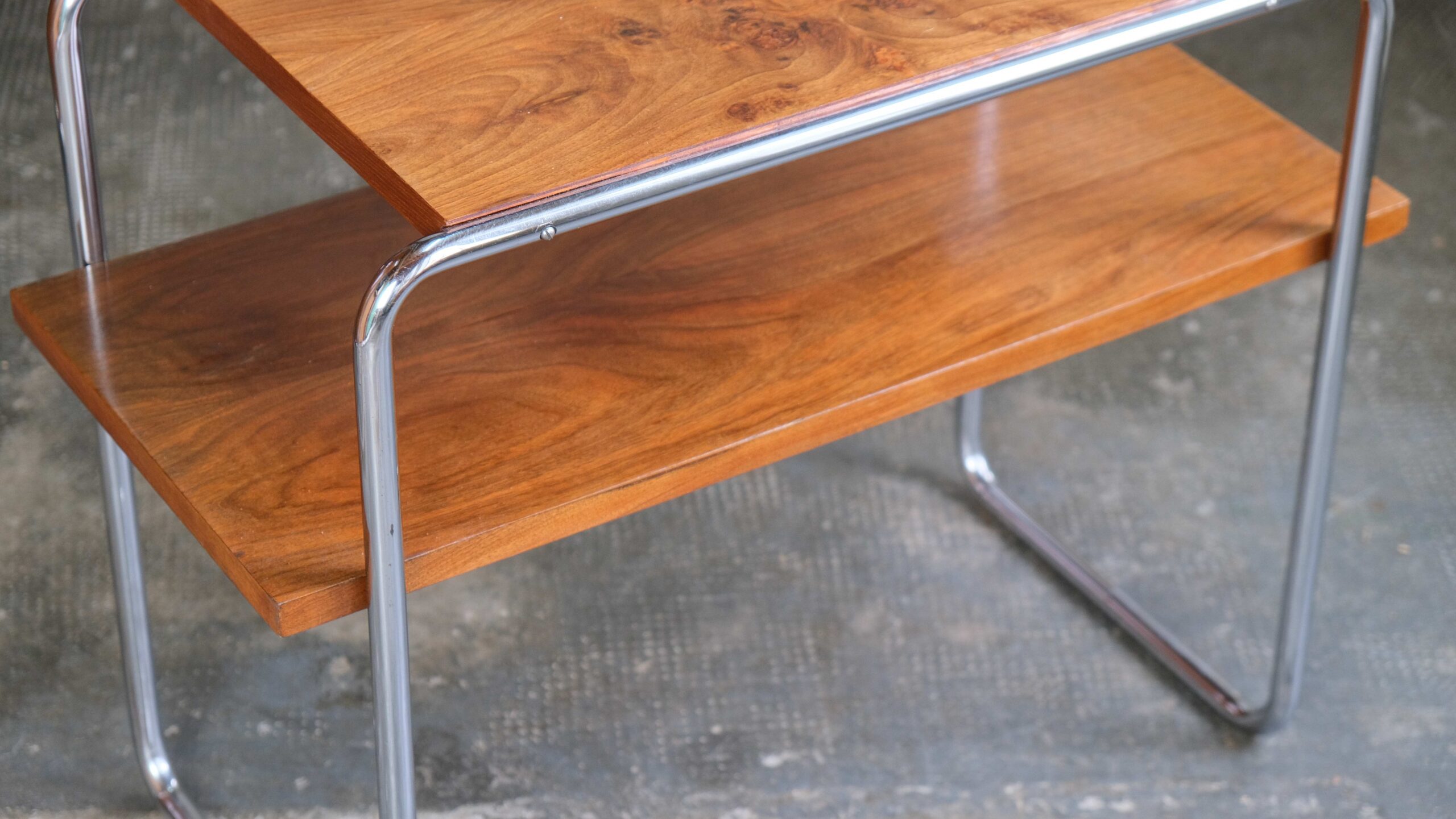 Seltener restaurierter Beistelltisch, Modell B12 aus Thonet Lizenzfertigung (vermutlich 30er oder 40er Jahre), nach dem Entwurf von Marcel Breuer. Die untere Tischplatte ist original (neu lasiert); die obere Platte wurde neu angefertigt. Das Stahlrohrgestell befindet sich im Originalzustand und zeigt einen sehr schönen Glanz. Abmessungen (ca.): Höhe 61,0cm / Breite 75,0cm / Tiefe 38,5cm Die Dekoration ist nicht Bestandteil des Angebotes.