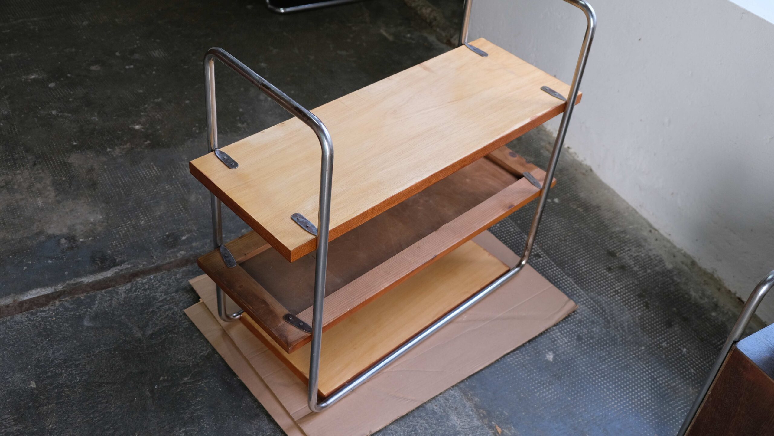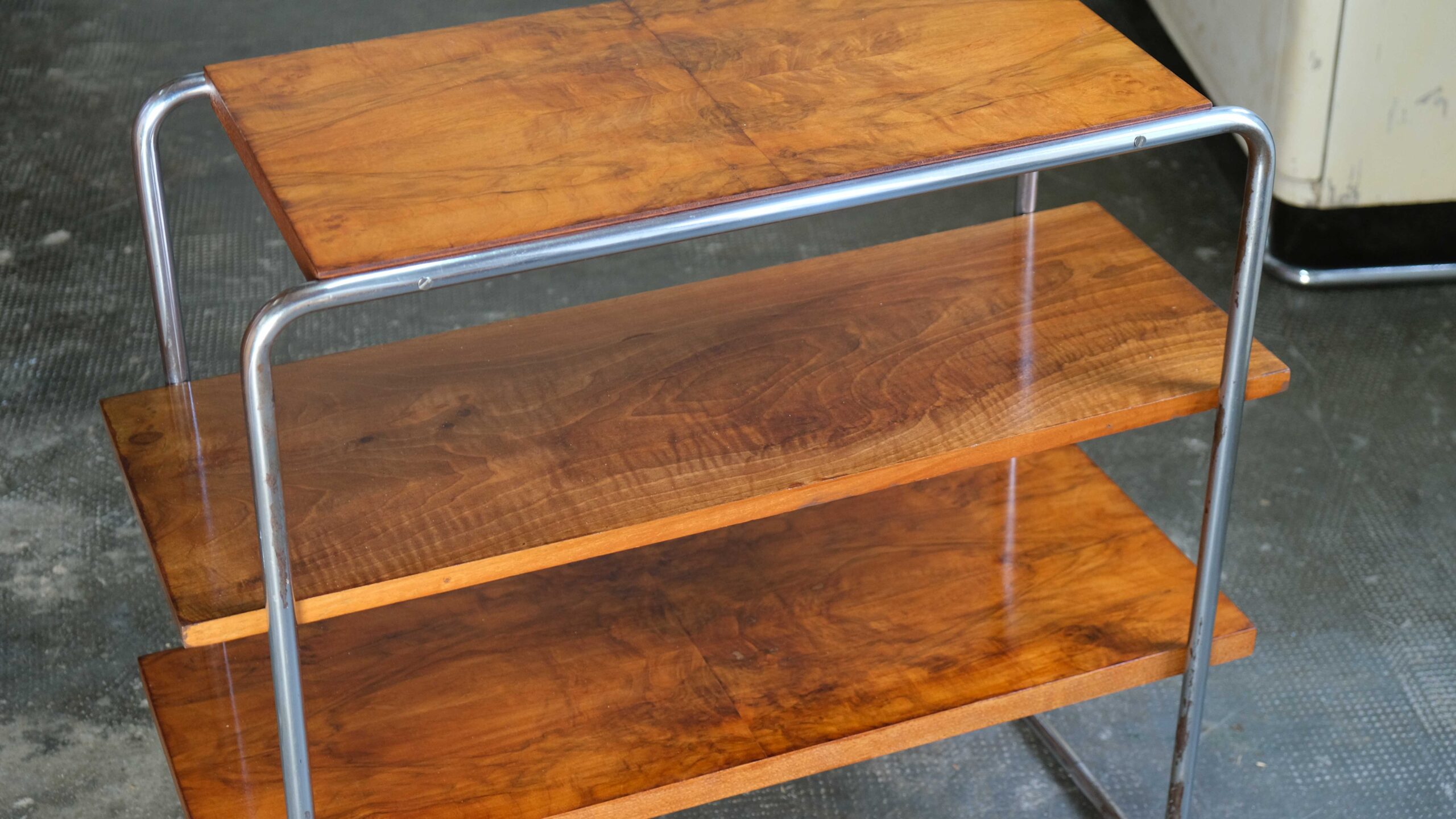 Teilrestauriertes Bauhaus Stahlrohr Regal nach dem Entwurf von Marcel Breuer, Modell B22, sehr wahrscheinlich aus Thonet Lizenzfertigung. Die mittlere Platte ist original, die obere und untere Platte wurden neu angefertigt und sind etwas dicker. Das Stahlrohrgestell weist einige Korrosionsschäden auf. Bitte beachten Sie: Der Versand des Tisches erfolgt ggf. zerlegt. Abmessungen (ca.): Breite 78,0cm / Tiefe 35,0cm / Höhe 70,0cm Die Dekoration ist nicht Bestandteil des Angebotes.