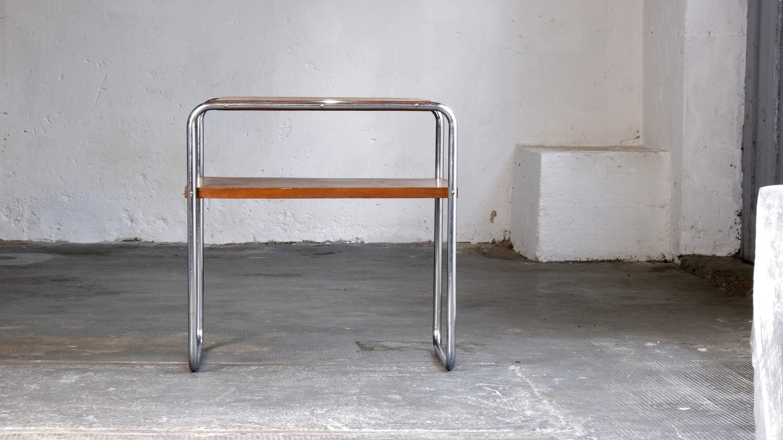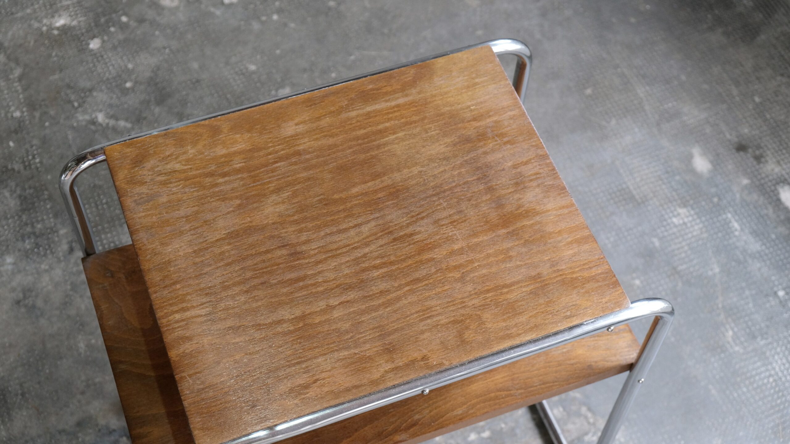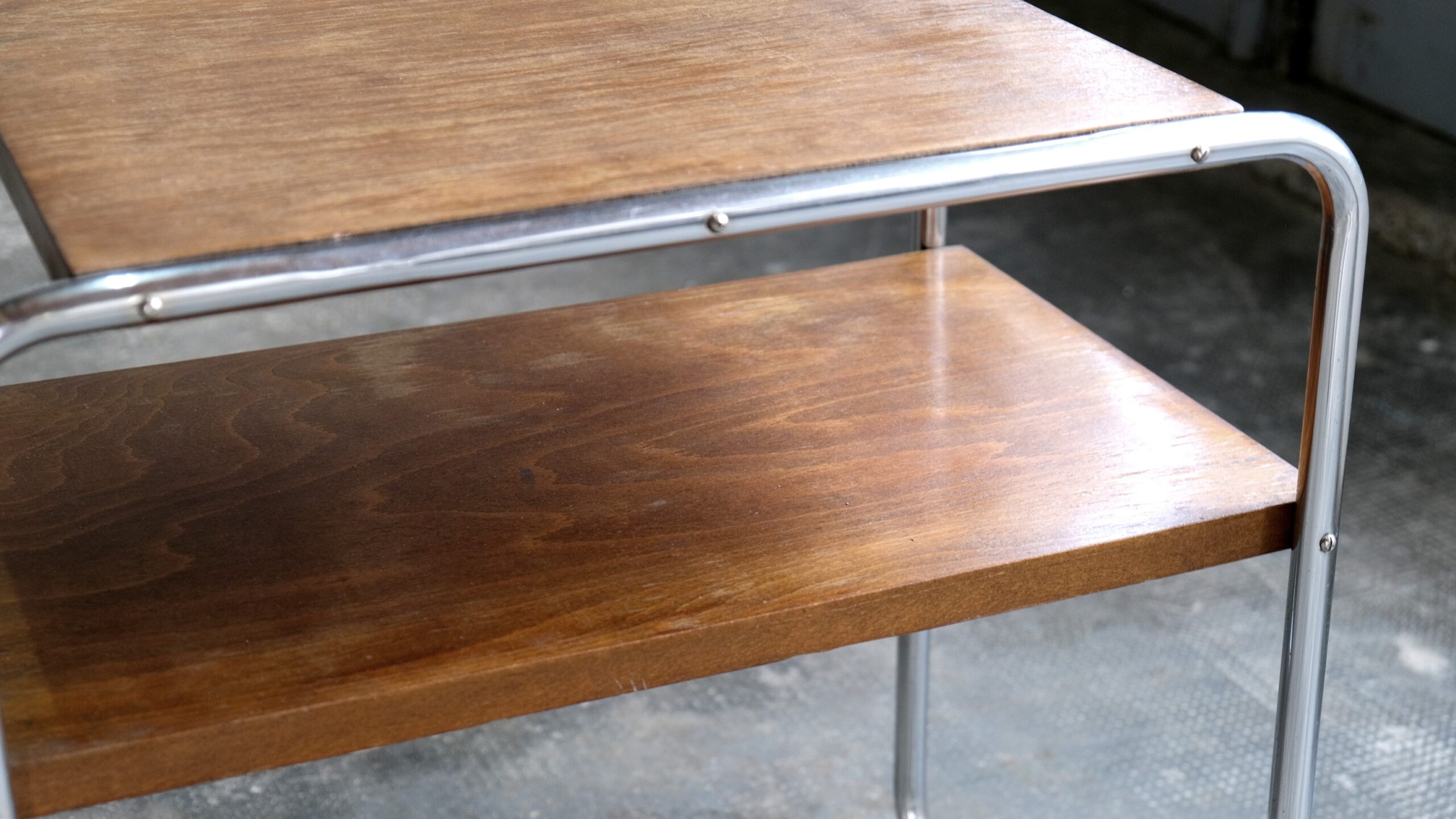 Seltener kleiner Bauhaus Beistelltisch mit zwei Holzablagen (Rahmenkonstruktion). Die Proportionen und Abmessungen kommen dem (heute noch erhältlichen) Thonet B 9 D/1 Beistelltisch, nach dem Entwurf von Marcel Breuer, sehr nahe. Das Alter ist leider nicht bekannt; die Art der Fertigung lässt auf eine eher frühe Produktion schließen. Die Holzoberflächen weisen einige Gebrauchsspuren auf; das Stahlrohr zeigt neben kleineren Kratzern durchgehend einen schönen Glanz; im unteren Bereich sind leichte Korrosionsspiuren erkennbar. Bitte beachten Sie: Für einen internationalen Versand wird der Tisch ggf. zerlegt. Abmessungen (ca.): Breite 59,5cm / Tiefe 40,0cm / Höhe 61,0cm / Höhe Zwischenfach 41,0cm