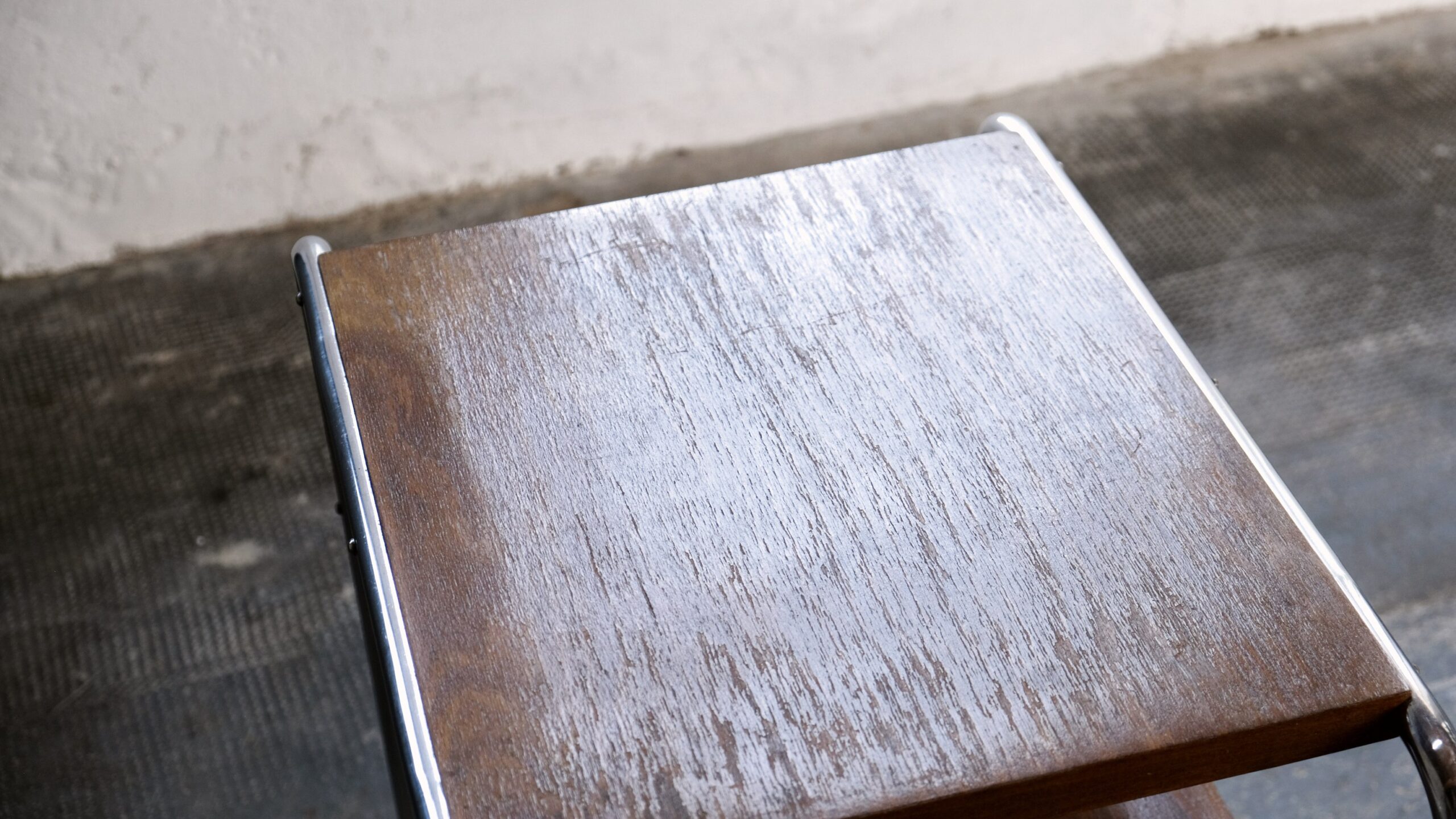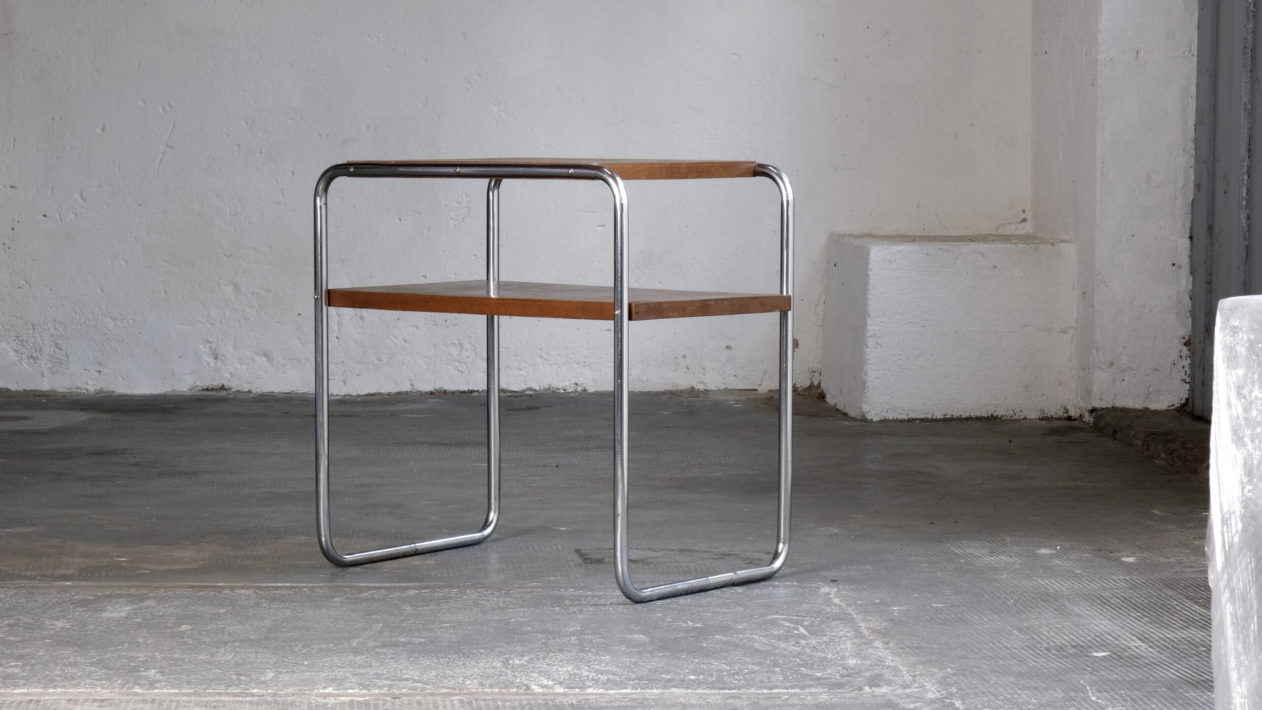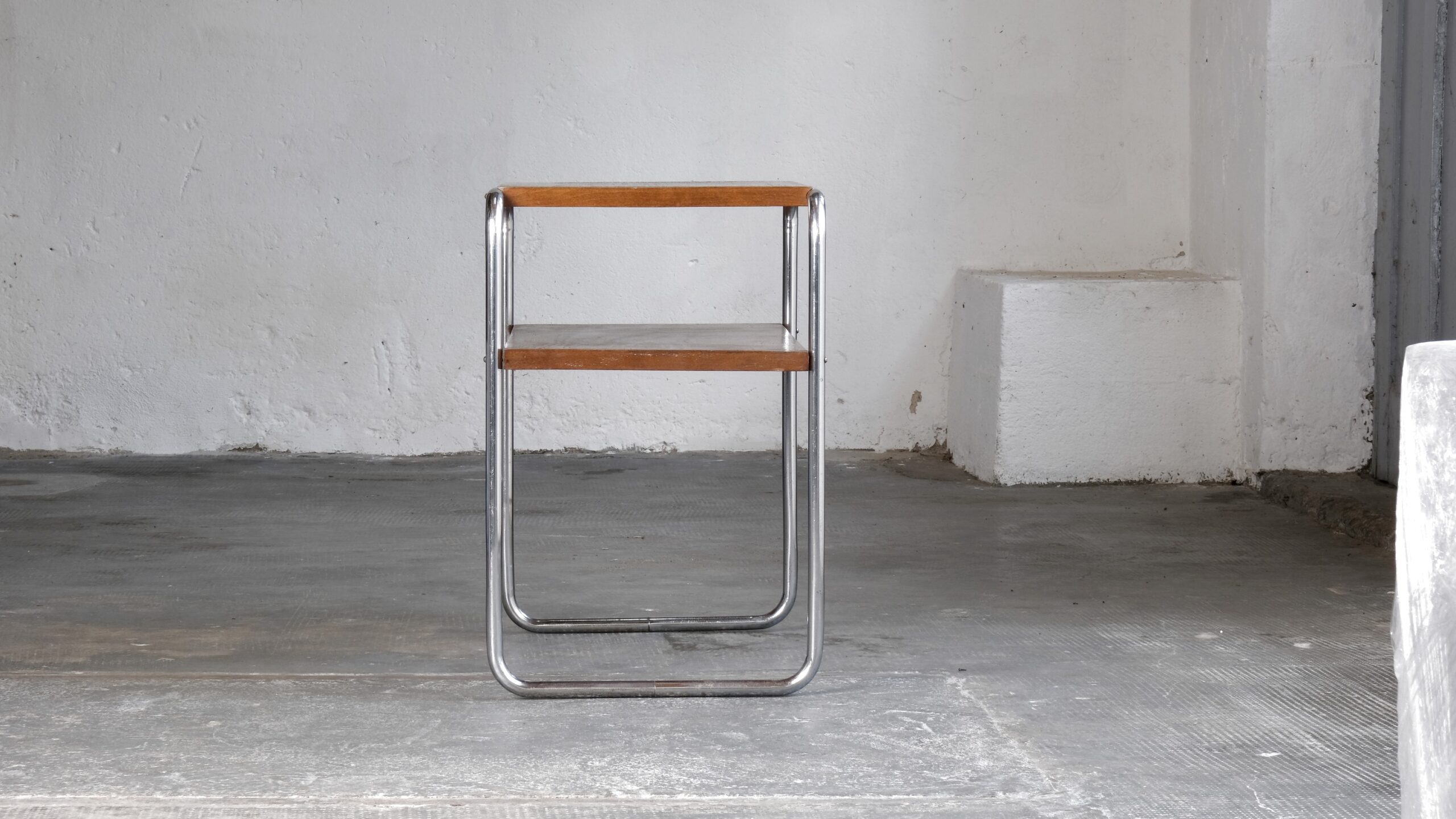 Seltener kleiner Bauhaus Beistelltisch mit zwei Holzablagen (Rahmenkonstruktion). Die Proportionen und Abmessungen kommen dem (heute noch erhältlichen) Thonet B 9 D/1 Beistelltisch, nach dem Entwurf von Marcel Breuer, sehr nahe. Das Alter ist leider nicht bekannt; die Art der Fertigung lässt auf eine eher frühe Produktion schließen. Die Holzoberflächen weisen einige Gebrauchsspuren auf; das Stahlrohr zeigt neben kleineren Kratzern durchgehend einen schönen Glanz; im unteren Bereich sind leichte Korrosionsspiuren erkennbar. Bitte beachten Sie: Für einen internationalen Versand wird der Tisch ggf. zerlegt. Abmessungen (ca.): Breite 59,5cm / Tiefe 40,0cm / Höhe 61,0cm / Höhe Zwischenfach 41,0cm