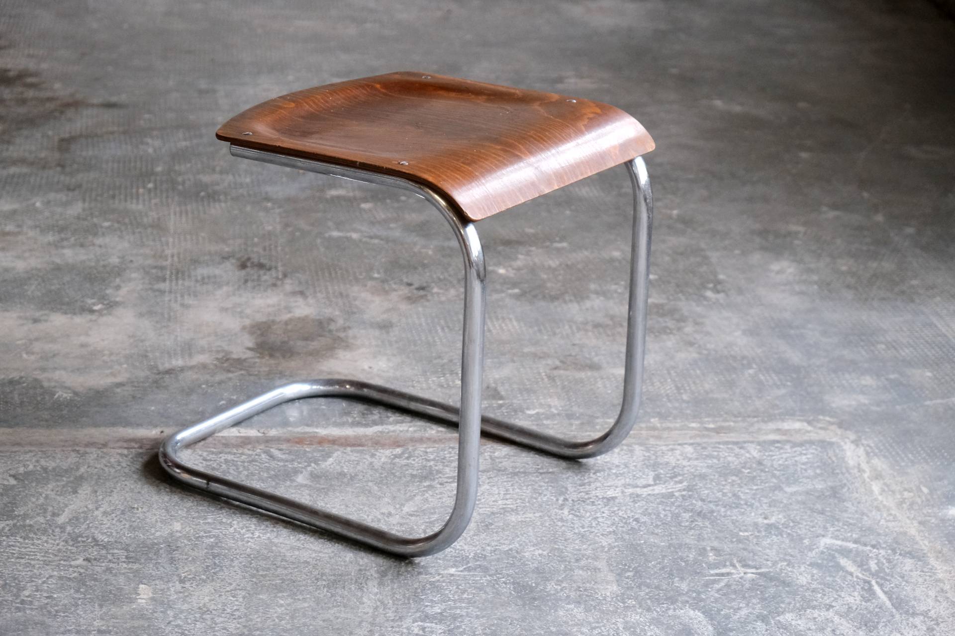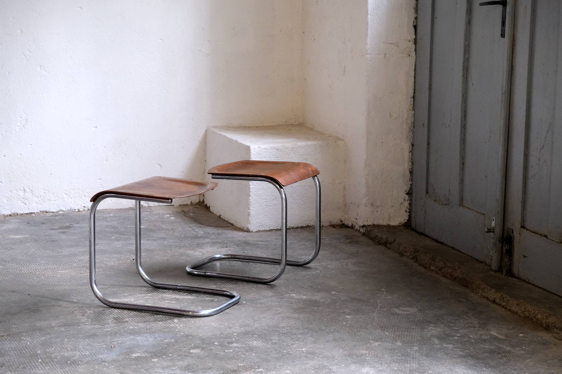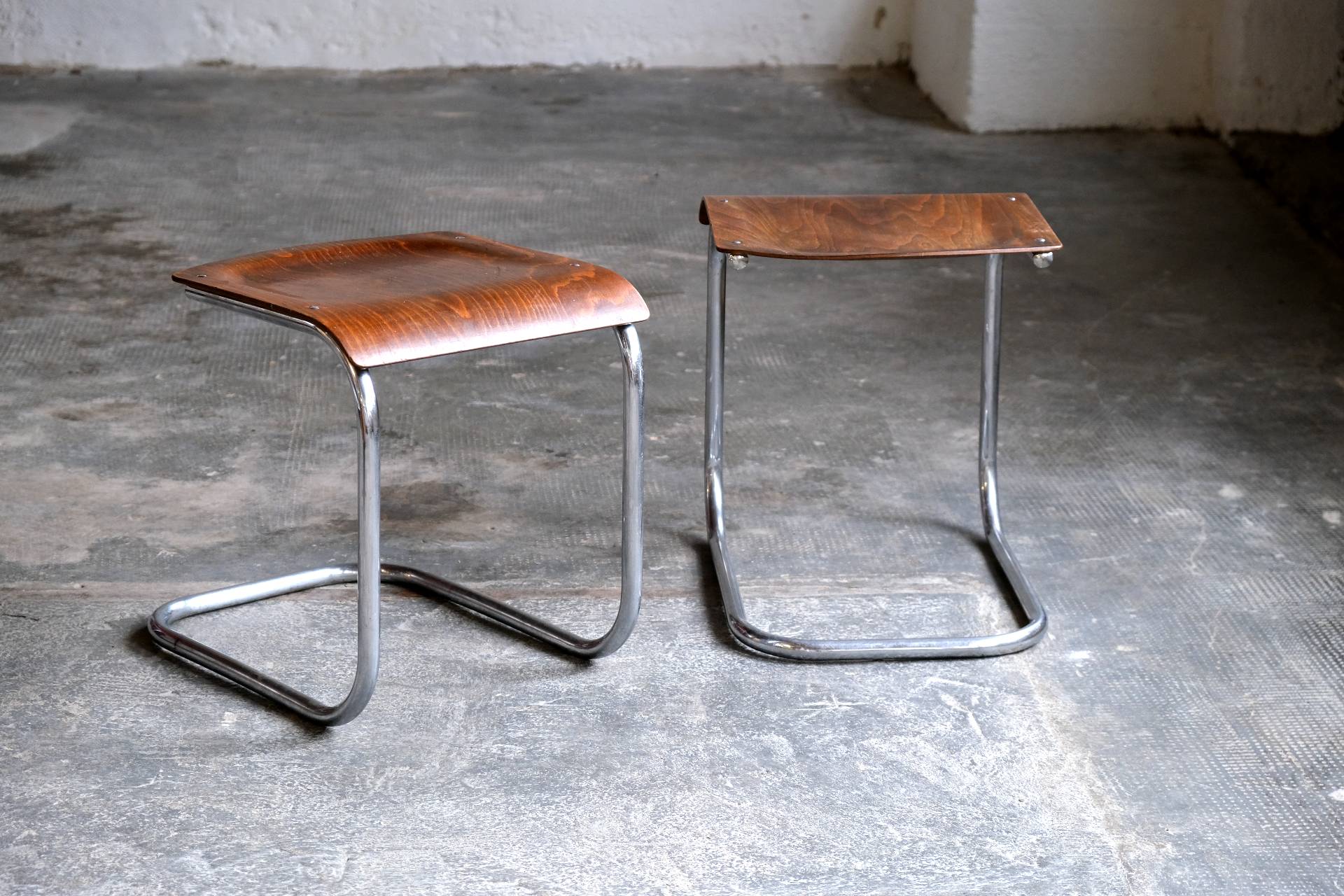 Timeless Bauhaus stool designed by Mart Stam with dark brown wood veneer in very nice condition. The seat and the steel tube show some scratches and signs of wear; the chrome plating is nevertheless very well preserved and shows a nice shine. There are two identical stools with similar grain and color of the wood veneer. Dimensions: Height 45cm, width 40cm, depth 52cm