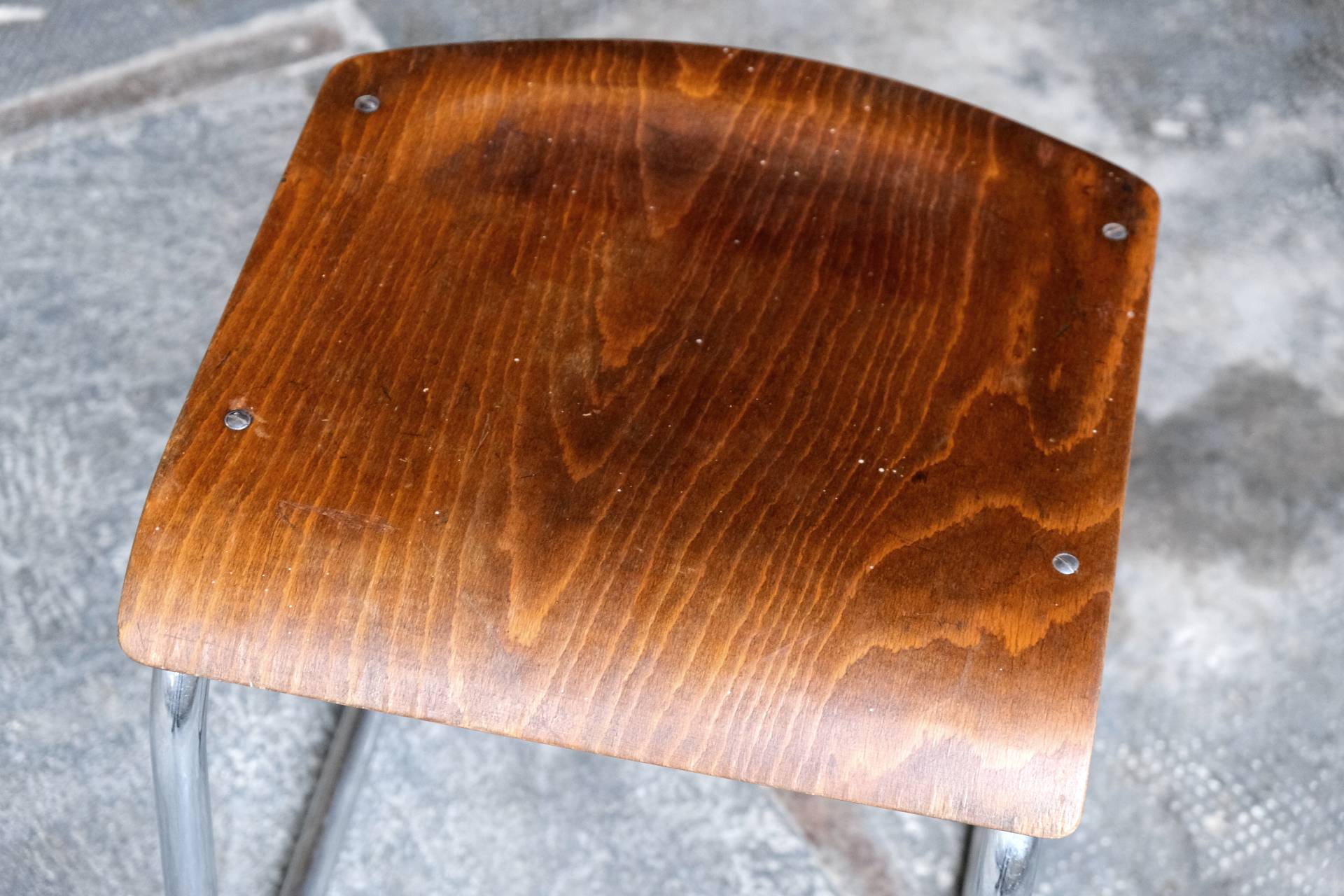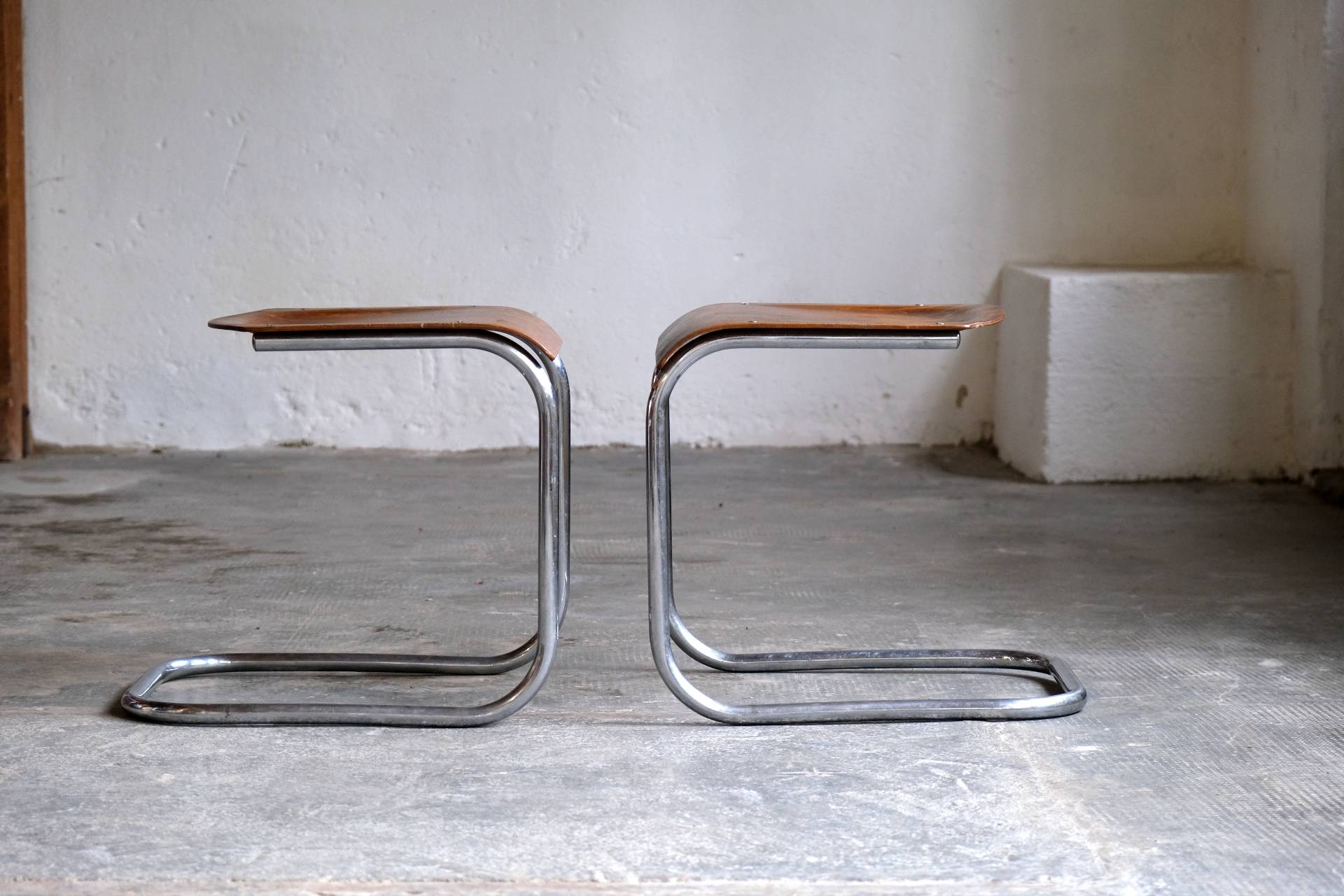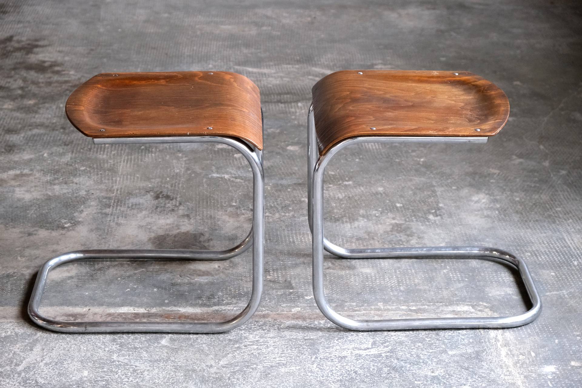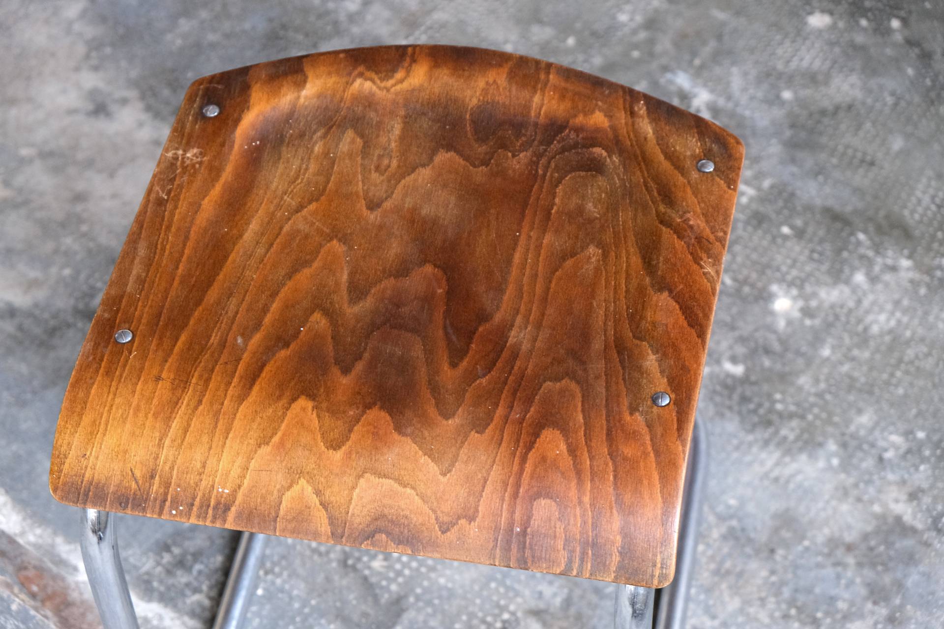 Timeless Bauhaus stool designed by Mart Stam with dark brown wood veneer in very nice condition. The seat and the steel tube show some scratches and signs of wear; the chrome plating is nevertheless very well preserved and shows a nice shine. There are two identical stools with similar grain and color of the wood veneer. Dimensions: Height 45cm, width 40cm, depth 52cm