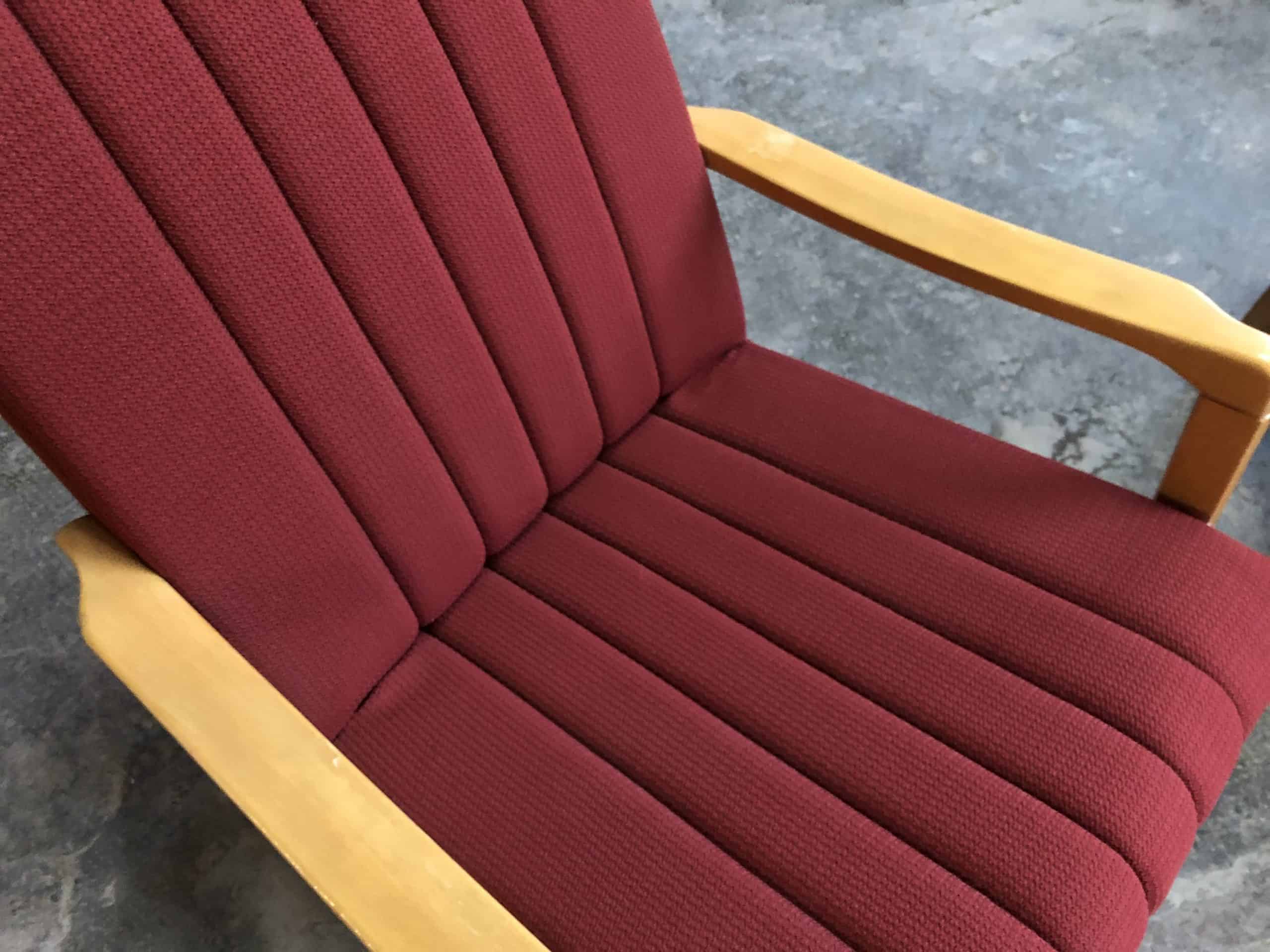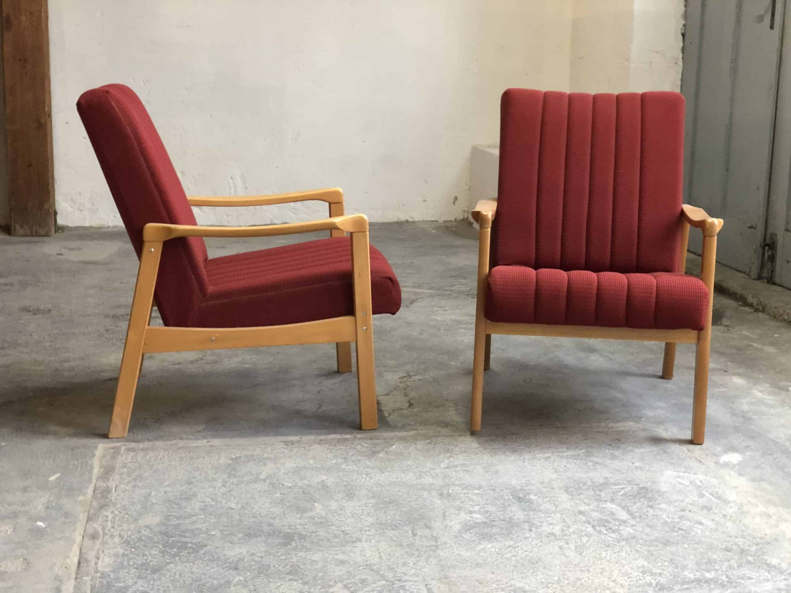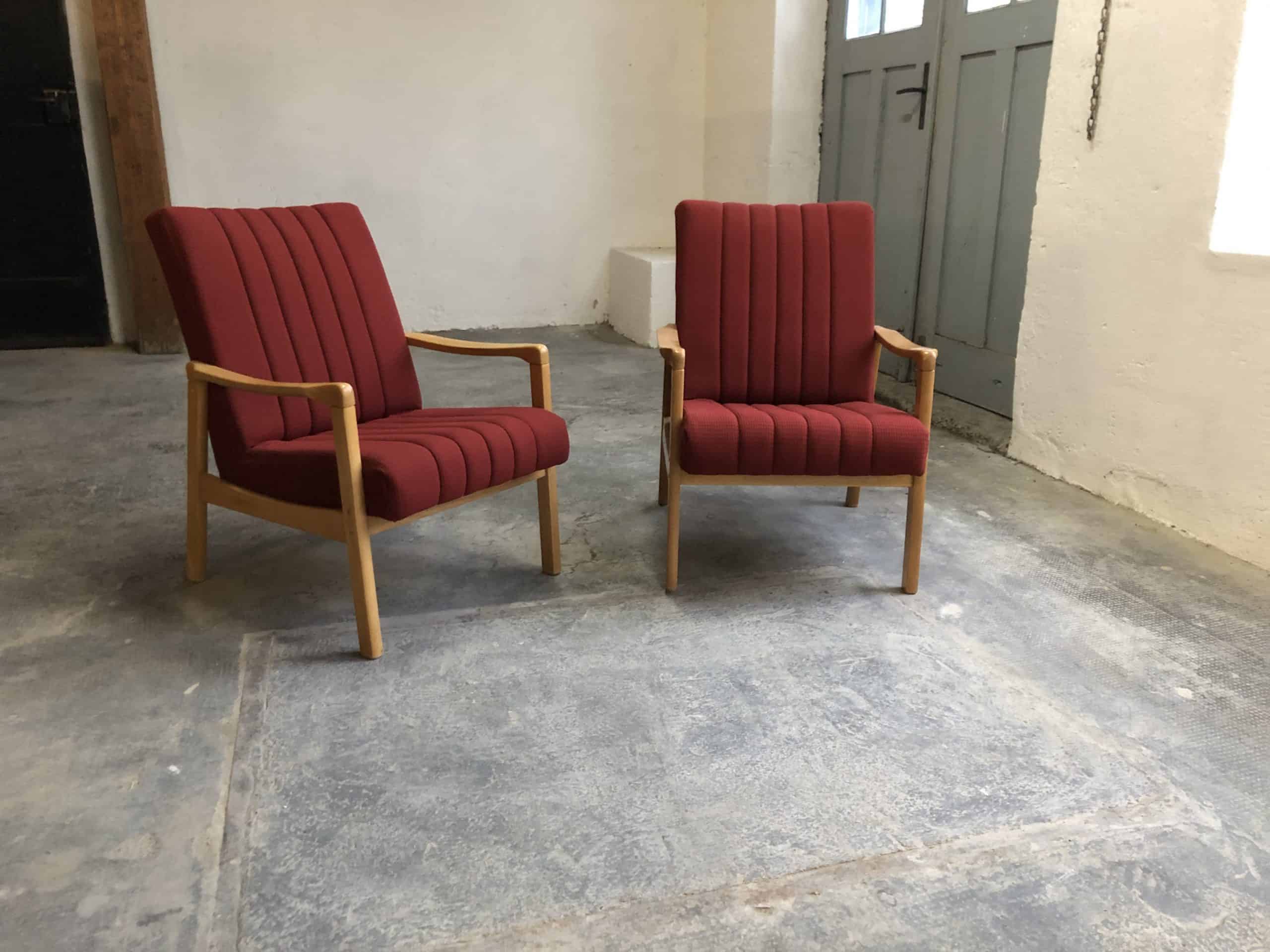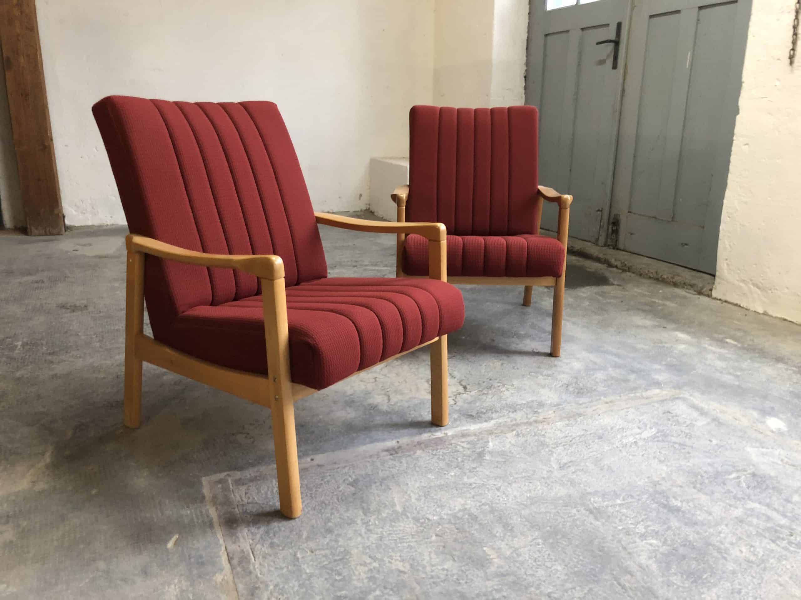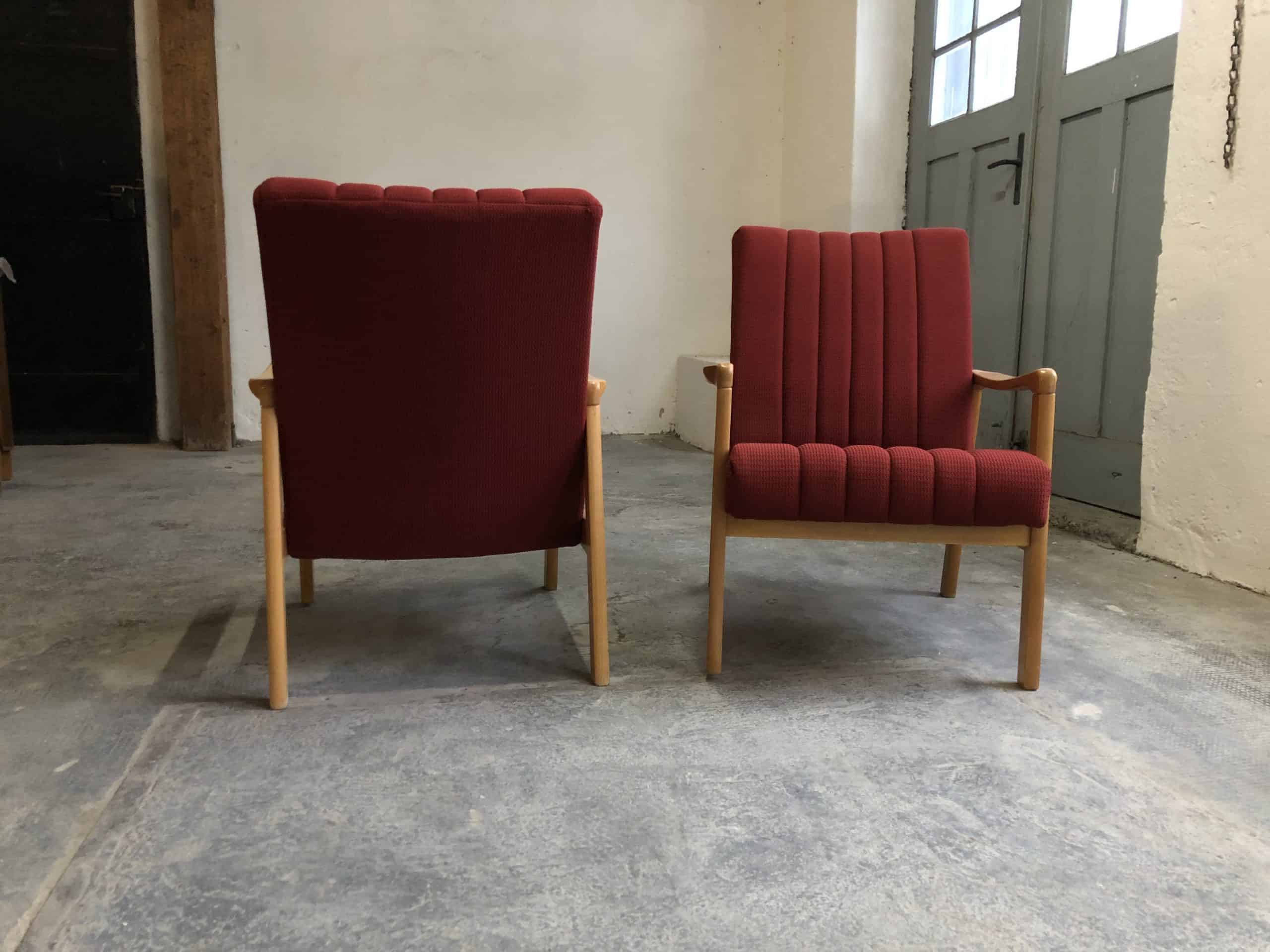 Two Mid Century armchairs with light wood frame and dark red fabric covers. The wooden frames are in very good condition and show only minor signs of time. The upholstery covers are also in good condition and do not need to be replaced. Dimensions (approx.) width 64cm – height back 76cm – height armrests 50cm – depth 47cm (middle of wooden frame) – seat height 35cm