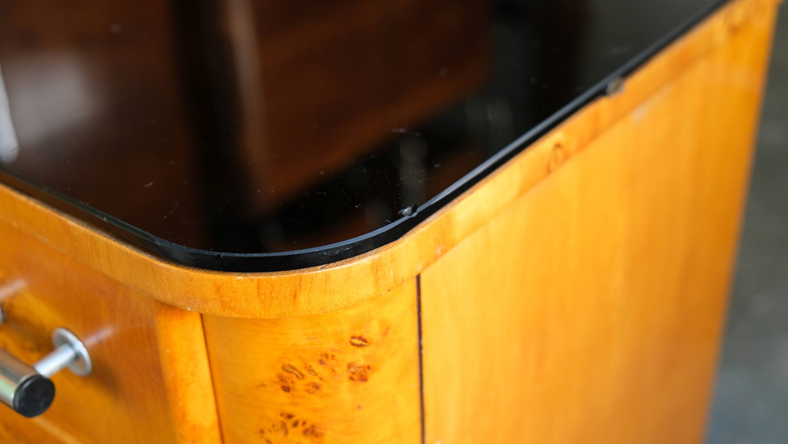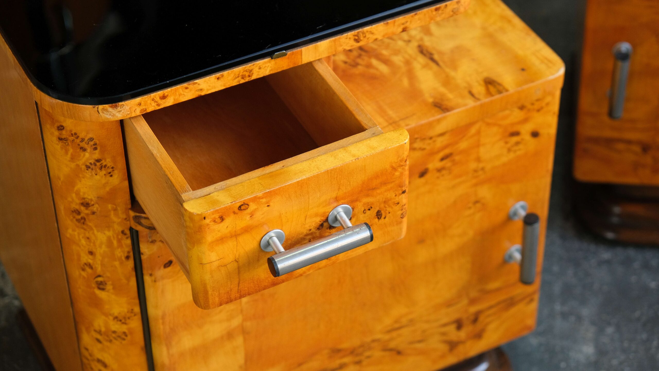 Set aus zwei ausgefallenen Art déco Nachttischen, wahrscheinlich aus den 50er Jahren, in sehr schönem Vintage Zustand. Aufwendige Machart mit Vogelaugenahorn Furnier. Beide Tische verfügen jeweils über eine Schublade und ein Fach mit Tür. Die schwarzen original Glasplatten weisen zahlreiche Kratzer auf, sind aber mit Ausnahme einer kleinen Beschädigung an der Seite (s. Foto) ebenfalls gut erhalten. Abmessungen jeweils (ca.): Breite 46,5cm / Tiefe 38,0cm + Griffe / Höhe 56,0cm / Höhe Ablage 44,0cm Die Dekoration ist nicht Bestandteil des Angebotes.