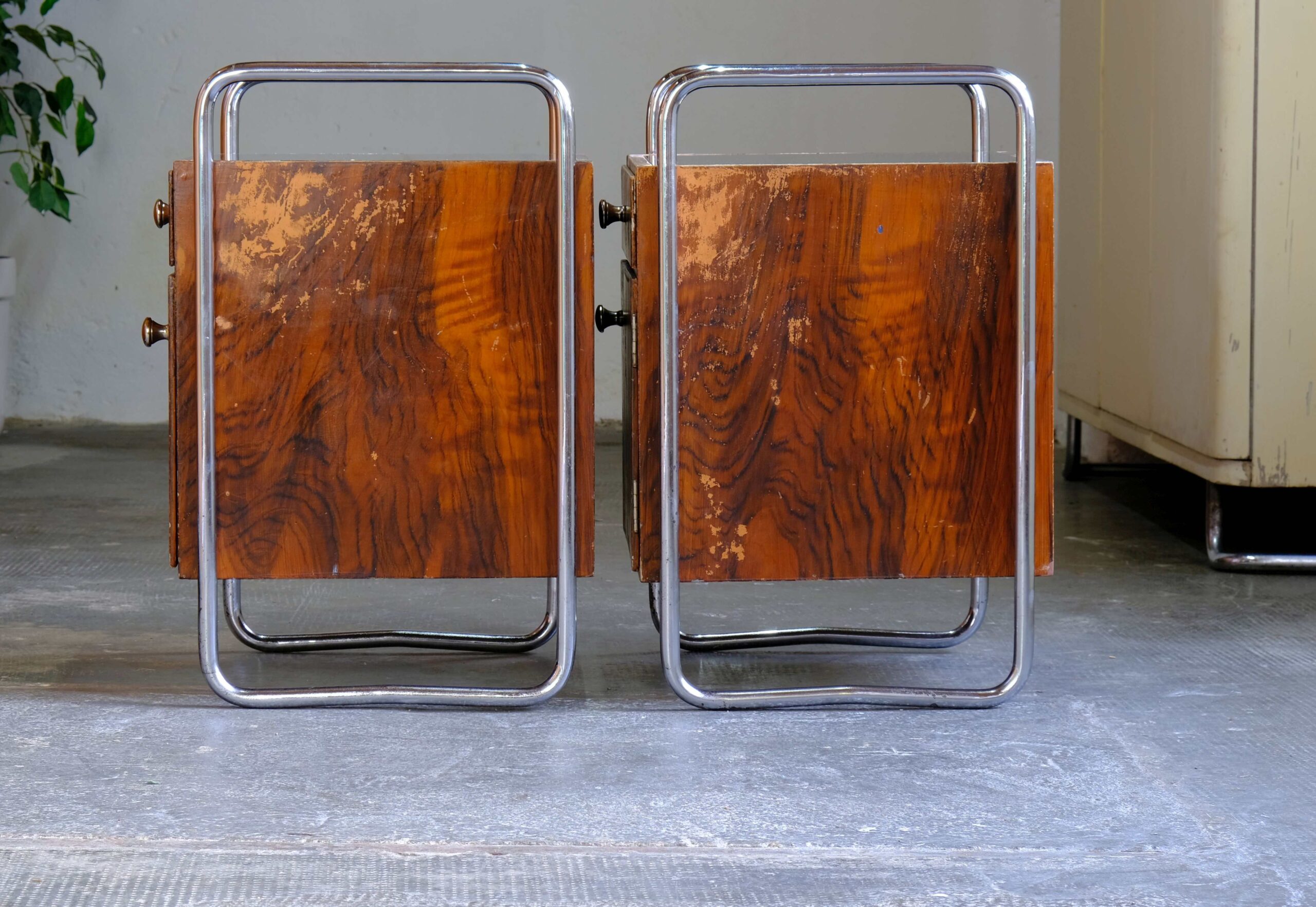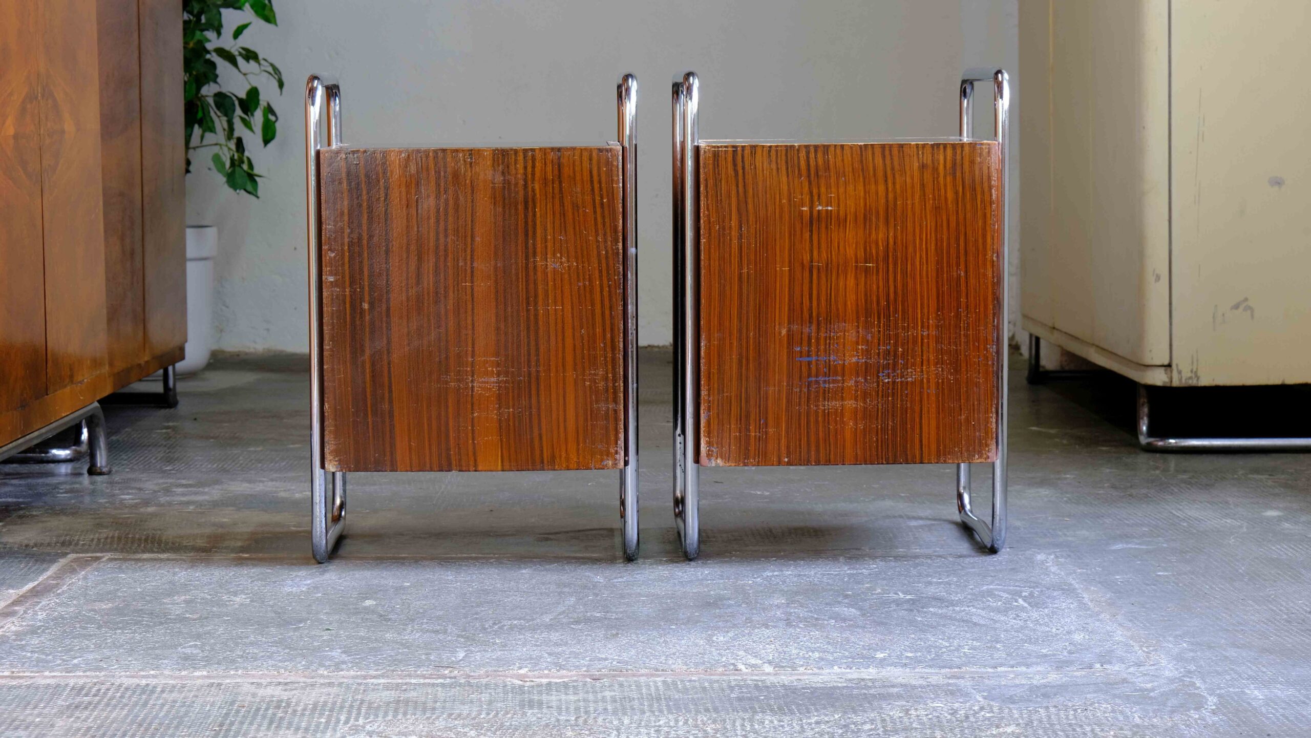 Set aus zwei außergewöhnlichen Bauhaus Stahlrohr Nachttischen mit brauner Holzmalerei. Die Gestelle wurden poliert und zeigen insgesamt einen sehr schönen Glanz; stellenweise sind Korrosionsschäden erkennbar. Die Holzmalerei weist deutliche Abnutzungsspuren auf, die Oberfläche ist dennoch glatt. Es wurden zwei neue schwarz bedruckte Glasplatten ergänzt. Abmessungen jeweils (ca.): Höhe 65,0cm (Stahlrohr) / Höhe 55,0cm (Kubus) / Breite 43,0cm / Tiefe 42,5cm + Griffe Die Dekoration ist nicht Bestandteil des Angebotes.