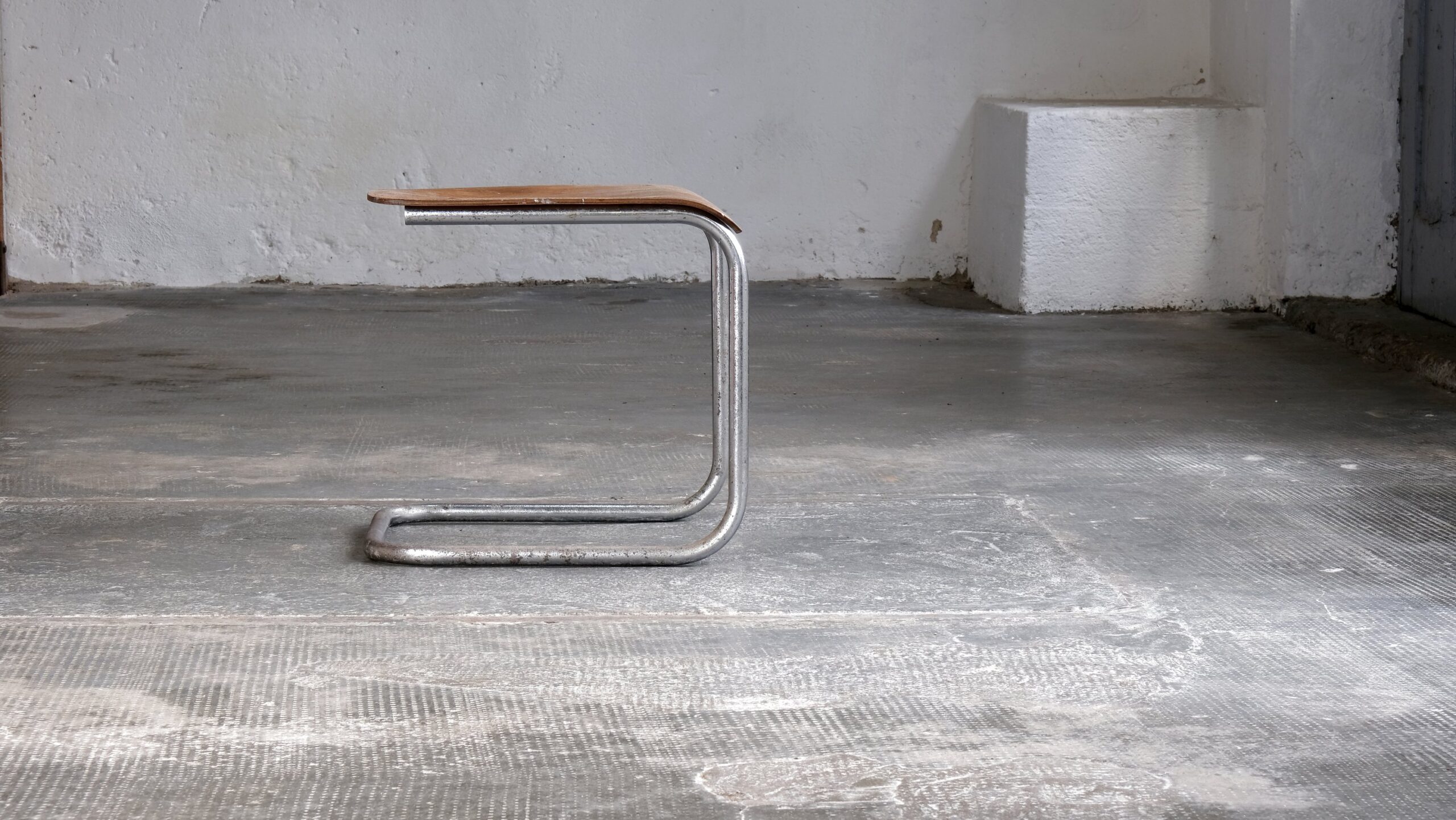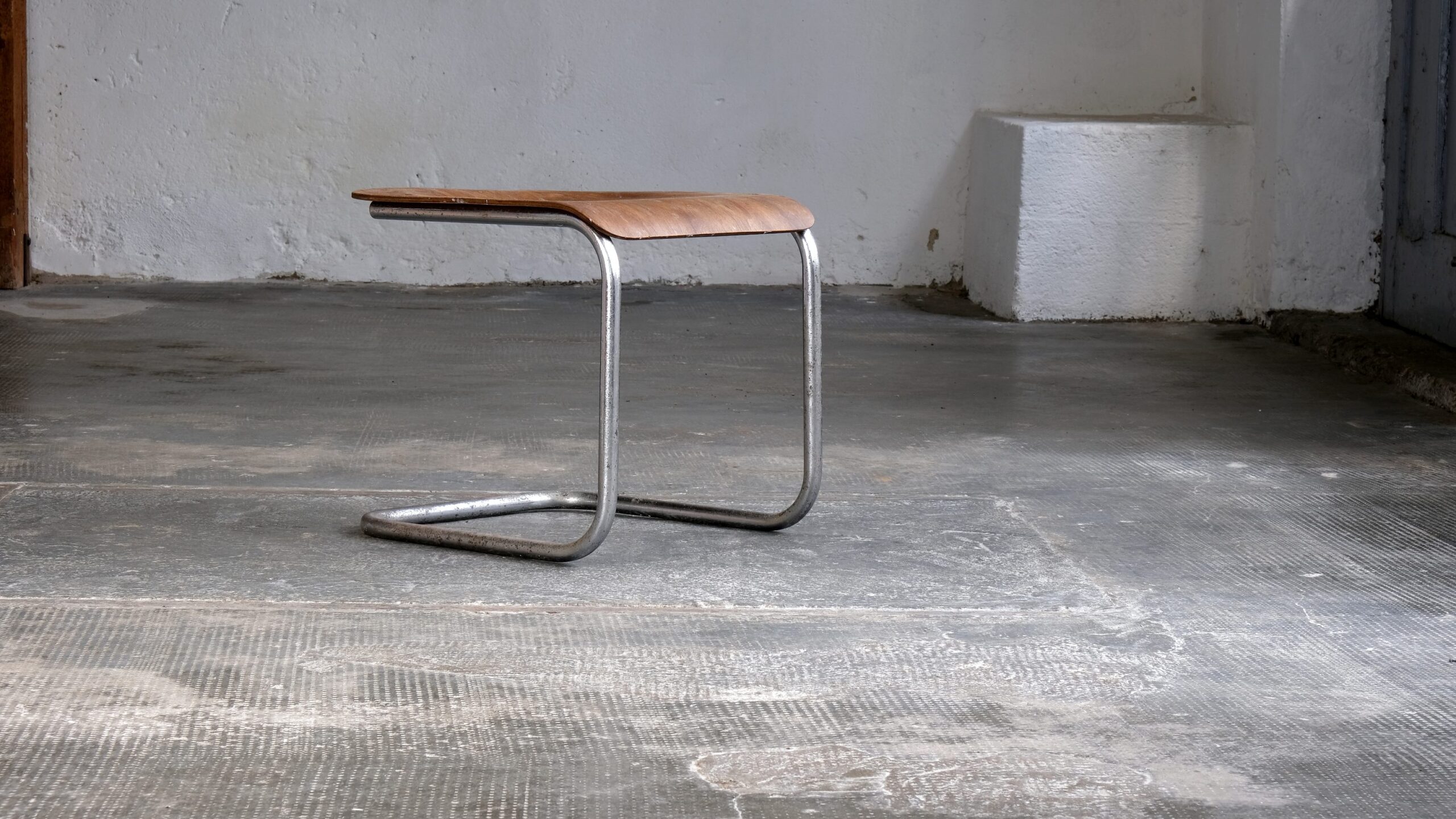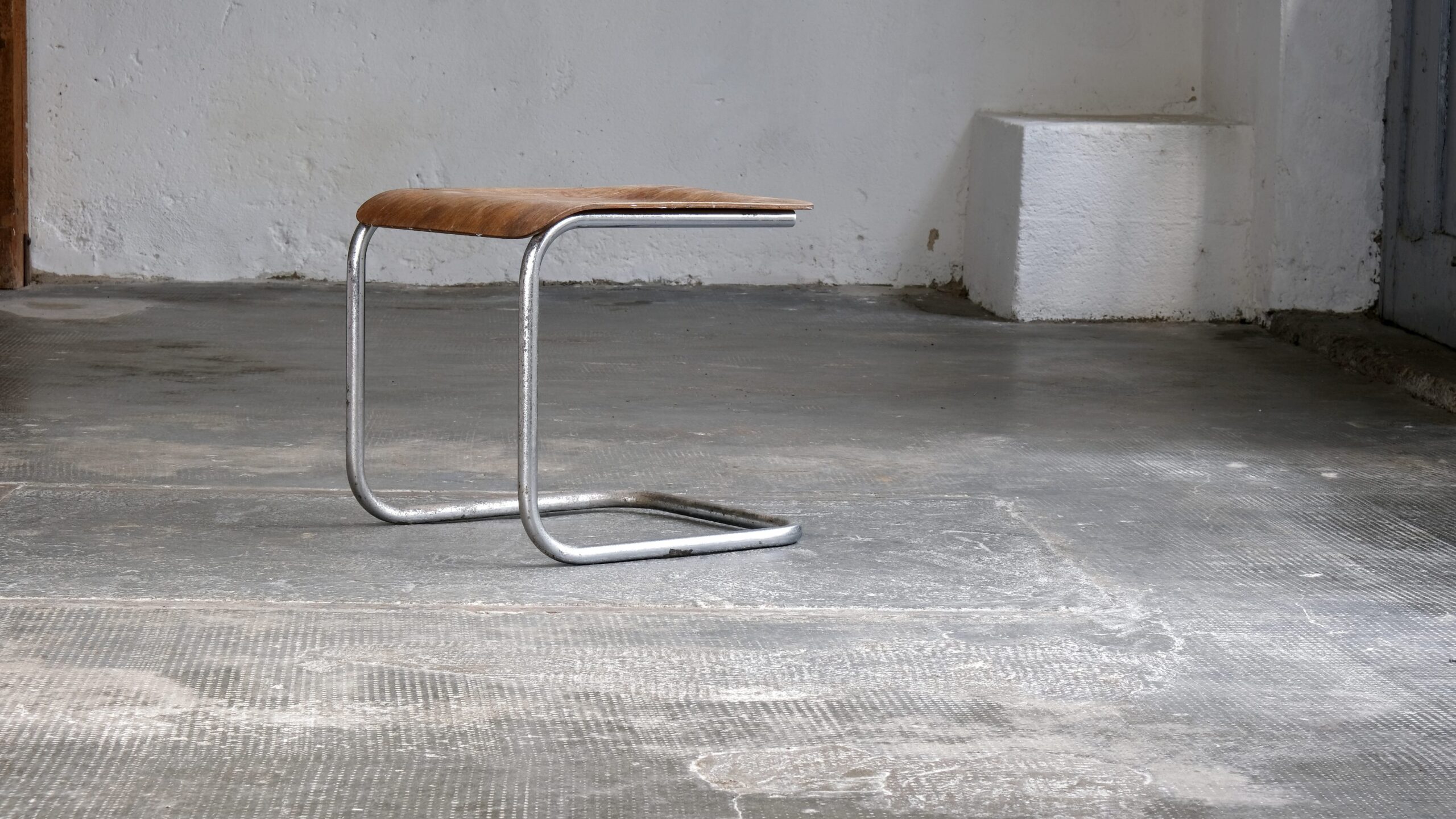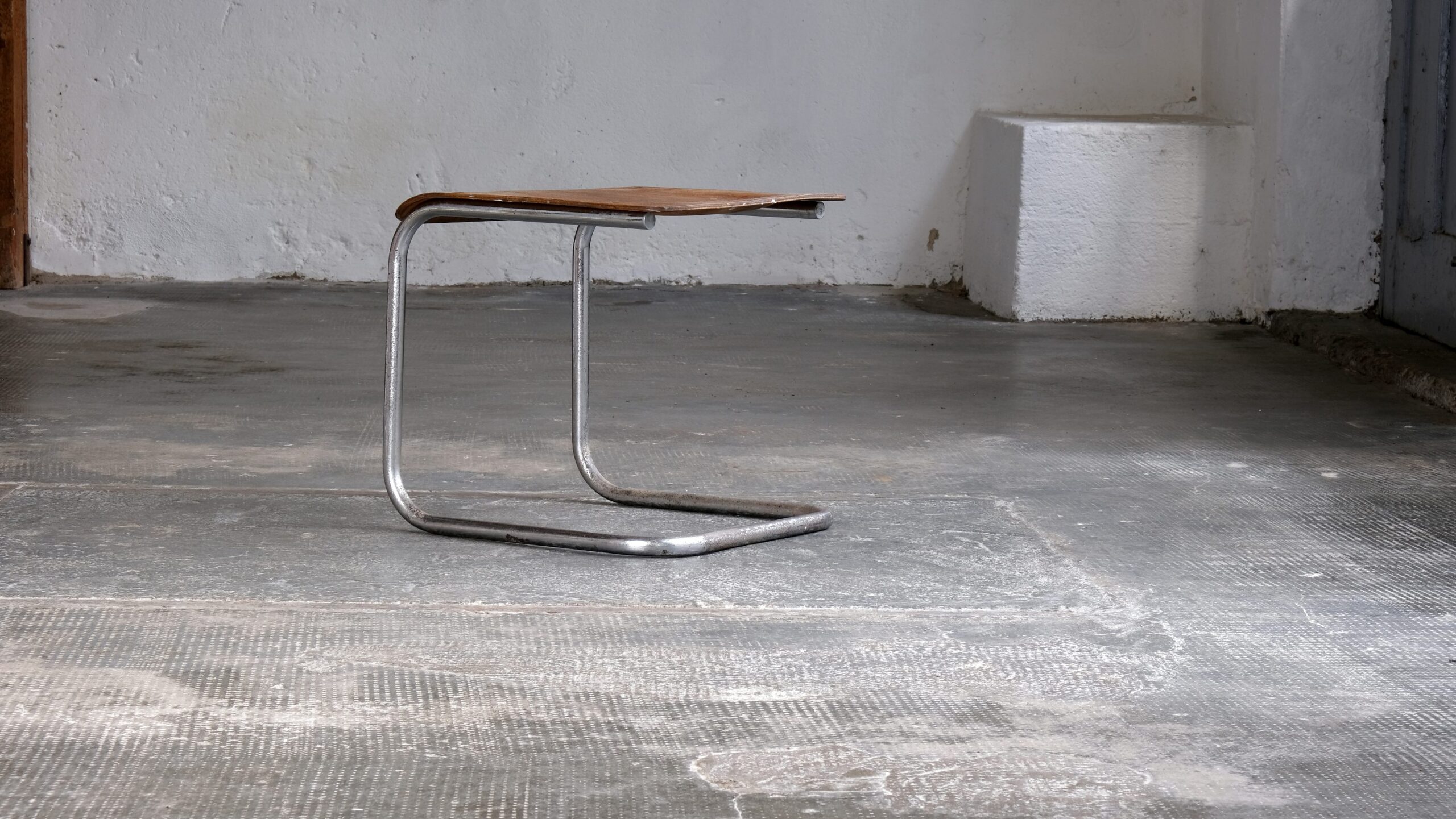 Bauhaus Hocker nach Mart Stam in restaurationsbedürftigem Zustand. Das Holz der Sitzfläche ist gut erhalten; im oberen Bereich zeigt auch die Verchromung noch einen schönen Glanz. Der Rest des Stahlrohres weist starke Korrosionsspuren auf (s. Fotos). Abmessungen (ca.): Breite 40,0cm / Tiefe 42,0cm / Höhe 41,0cm