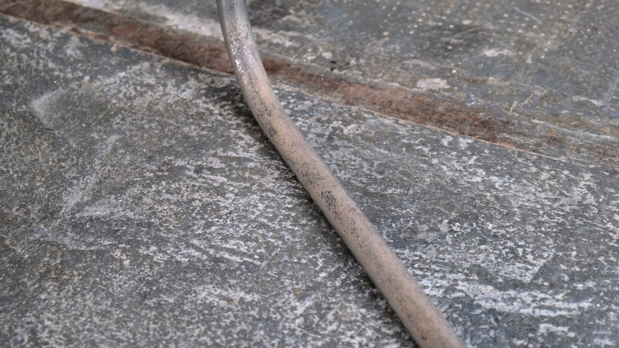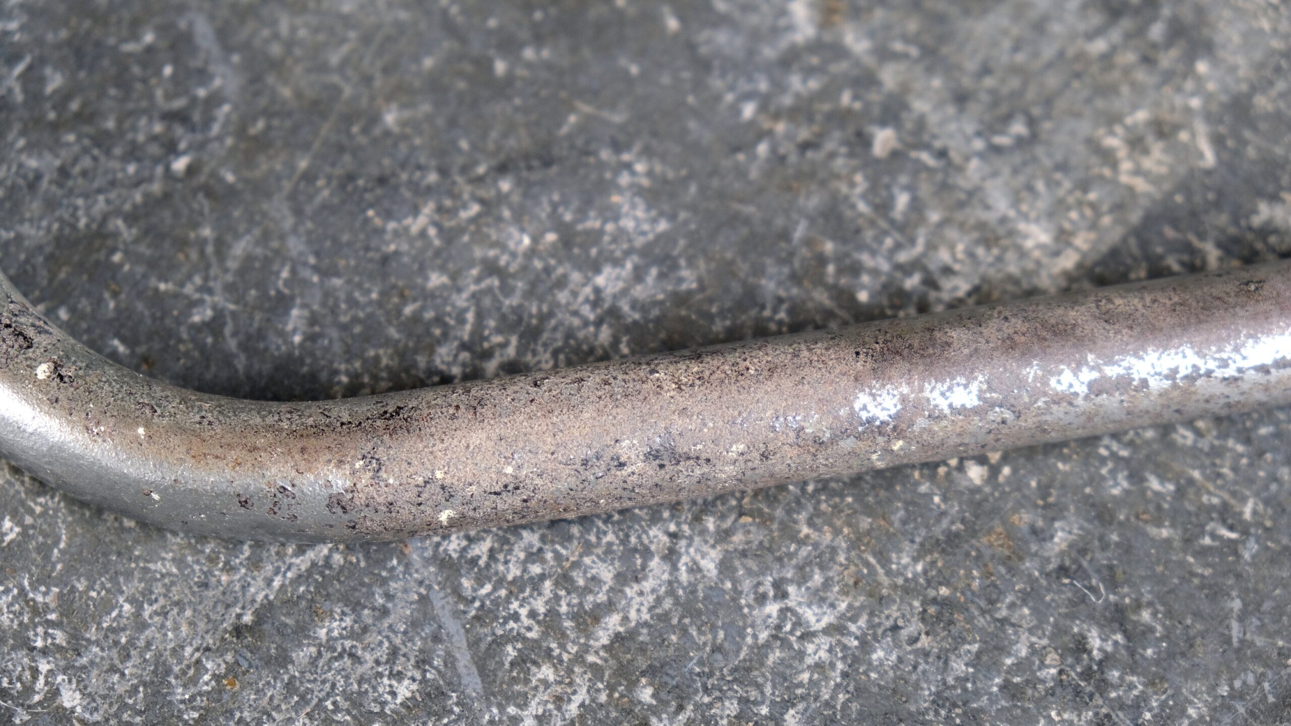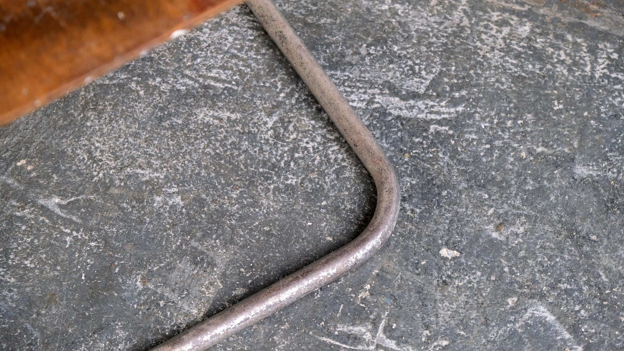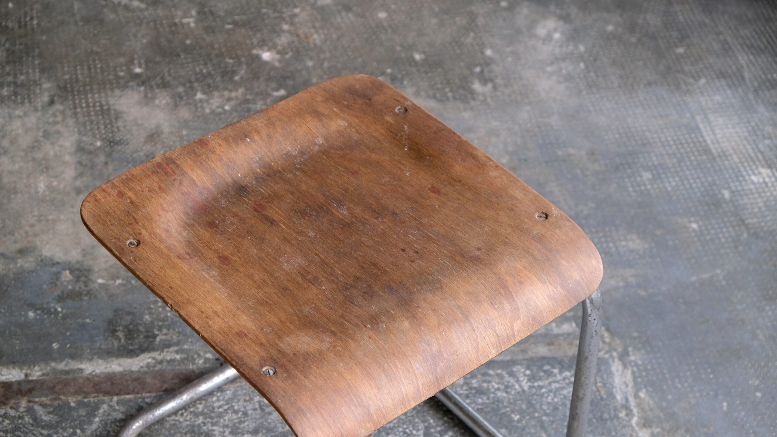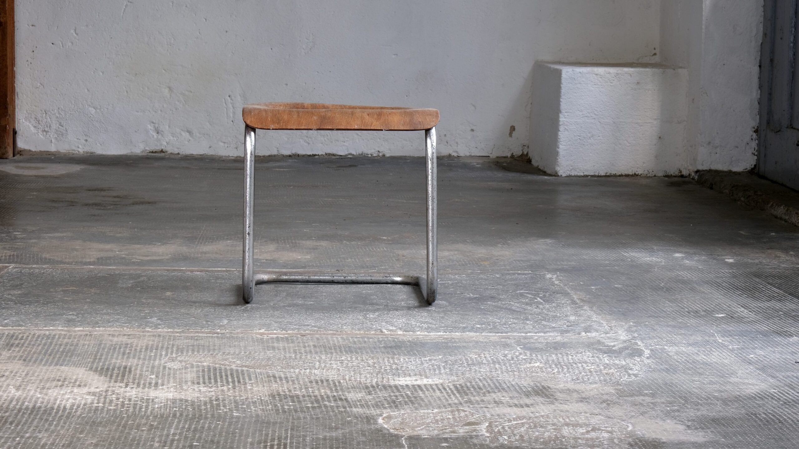 Bauhaus Hocker nach Mart Stam in restaurationsbedürftigem Zustand. Das Holz der Sitzfläche ist gut erhalten; im oberen Bereich zeigt auch die Verchromung noch einen schönen Glanz. Der Rest des Stahlrohres weist starke Korrosionsspuren auf (s. Fotos). Abmessungen (ca.): Breite 40,0cm / Tiefe 42,0cm / Höhe 41,0cm
